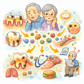 今回は高齢者と虫歯についてのお話です。高齢者は虫歯になりやすかったり、虫歯の進行が早かったりすると言われています。原因は様々ですが、主な原因として、唾液の分泌の減少、エナメル質が薄くなっている事、歯茎が下がることでエナメル質の薄い部分が露呈してしまう事等があげられます。虫歯や歯周病をそのままにしておくと、様々な病気の引き金になります。特に高齢者は、肺炎や動脈硬化のリスクが上がり、直接命に係わる事態の引き金になりかねません。普段から歯科でのメンテナンスを受け、歯周病を予防していきましょう。また、しっかり噛むことで脳の血流が良くなり、刺激が与えられるので、アルツハイマーの予防になります。また歯周病を予防する事で、脳の血管内で歯周病菌が炎症を起こし、血管を詰まらせる事を予防し、脳梗塞や脳の血管が硬くなることで引き起こされる型のアルツハイマーの予防にもなります。たかが口の中と軽く考えずに、しっかりとお口をキレイに保つ事が、健康寿命を延ばすことにつながります。いつまでもしっかり噛めるように、お口の中を大切にしていきましょう。